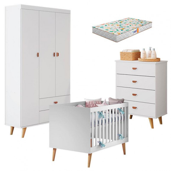 Escolher os móveis para o quarto do bebê não é uma tarefa fácil não é mesmo, mas estamos aqui para lhe ajudar, apresentamos a vocês essa linda opção de jogo de quarto infantil composto por Berço Americano da linha Ludmila que se transforma em mini cama e sofá cama aumentando a vida útil do móvel acompanhando as fases de crescimento da criança, a Cômoda com 4 Gavetas e o Guarda Roupa 3 Portas da linha Duda conta com amplo espaço interno e ótimas repartições para maior praticidade e organização das roupinhas, sapatinhos e acessórios do seu baby, sistema de Travas Anti-Tombamento fixados na parede para segurança de todos evitando acidentes, lindo e delicado design na cor Branco Acetinado com Pés estilo Retrô na cor Bétula proporcionando modernidade e tranquilidade ao ambiente, desenvolvidos pela Carolina Baby com todo cuidado e carinho para sua família, fabricado com materiais de excelentes qualidades, resistência e durabilidade e ainda acompanha Colchão da Gazin. Não deixe de conferir e garantir o seu!