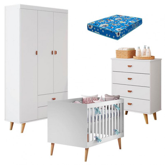 Escolher os móveis para o quarto do bebê não é uma tarefa fácil não é mesmo, mas estamos aqui para lhe ajudar, apresentamos a vocês essa linda opção de jogo de quarto infantil composto por Berço Americano da linha Ludmila que se transforma em mini cama e sofá cama aumentando a vida útil do móvel acompanhando as fases de crescimento da criança, a Cômoda com 4 Gavetas e o Guarda Roupa 3 Portas da linha Duda conta com amplo espaço interno e ótimas repartições para maior praticidade e organização das roupinhas, sapatinhos e acessórios do seu baby, sistema de Travas Anti-Tombamento fixados na parede para segurança de todos evitando acidentes, lindo e delicado design na cor Branco Acetinado com Pés estilo Retrô na cor Bétula proporcionando modernidade e tranquilidade ao ambiente, desenvolvidos pela Carolina Baby com todo cuidado e carinho para sua família, fabricado com materiais de excelentes qualidades, resistência e durabilidade e ainda acompanha Colchão da Ortobom. Não deixe de conferir e garantir o seu!