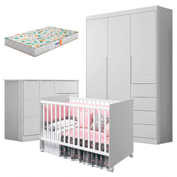 Quarto de Bebê Eloá com Berço Americano Tico Branco Acetinado e Colchão Gazin – Phoenix Baby