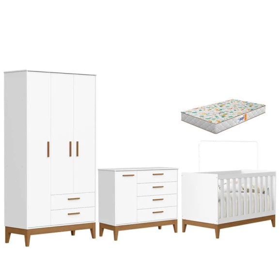 O Quarto de Bebê Flip da Reller é a escolha ideal para quem busca praticidade, beleza e conforto em um só conjunto. Com design moderno o kit com Roupeiro moderno é composto por um berço seguro e funcional, desenvolvido dentro das normas de qualidade, que garante noites tranquilas e acolhedoras. A Cômoda Sapateira oferece amplo espaço interno, equipada com corrediças telescópicas que proporcionam abertura suave, além de puxadores em MDF revestido e pés em madeira Para completar, o conjunto acompanha o Colchão Gazin, desenvolvido para oferecer o suporte ideal ao bebê, com estrutura firme e confortável. Desenvolvido pela Reller com toda praticidade.