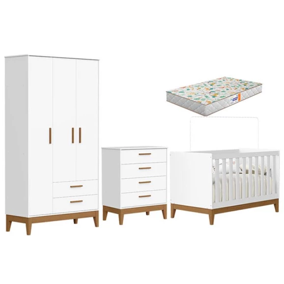Quarto de Bebê Flip com Cômoda Gaveteiro Branco Acetinado com Colchão Gazin - Reller