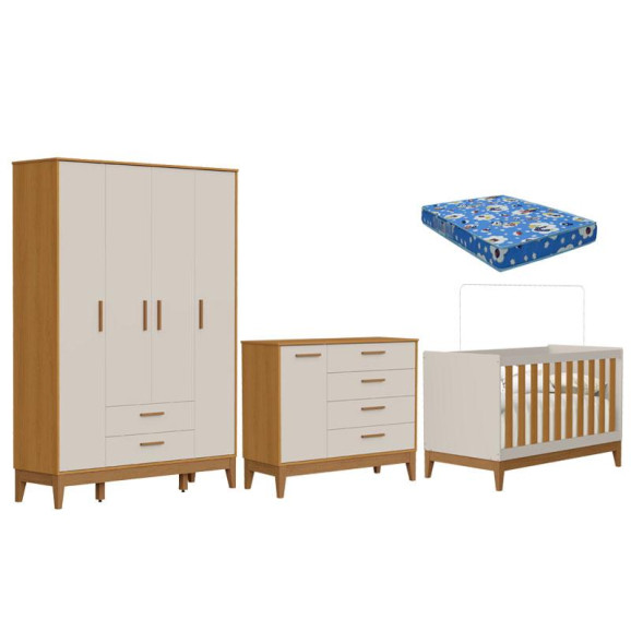 Quarto de Bebê Flip Guarda Roupa 4P Areia Acetinado Savana com Colchão - Reller