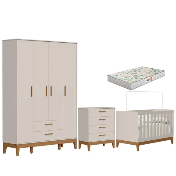 Quarto de Bebê Flip Guarda Roupa 4P Areia Acetinado com Colchão Gazin - Reller