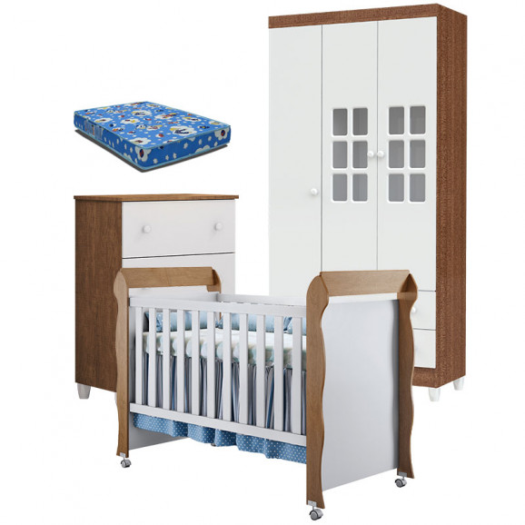 Quarto de Bebê Gaveteiro Mariah 3P e Berço Mirelle Branco Acetinado Amadeirado com Colchão - Carolina