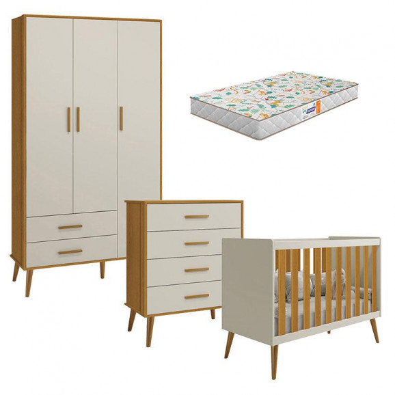 Quarto de Bebê Isis 3 Portas com Gaveteiro Areia Acetinado Savana e Colchão Gazin - Reller