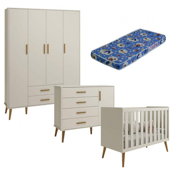 Quarto de Bebê Isis 4 Portas Areia Acetinado com Colchão Ortobom - Reller