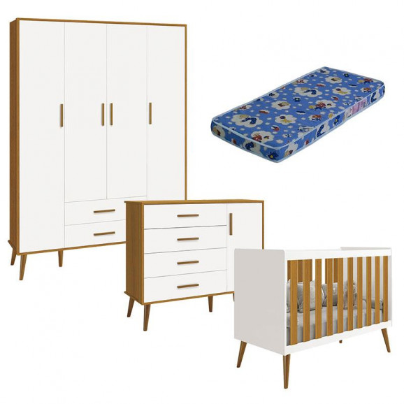 Quarto de Bebê Isis 4 Portas Branco Acetinado Savana com Colchão Ortobom - Reller