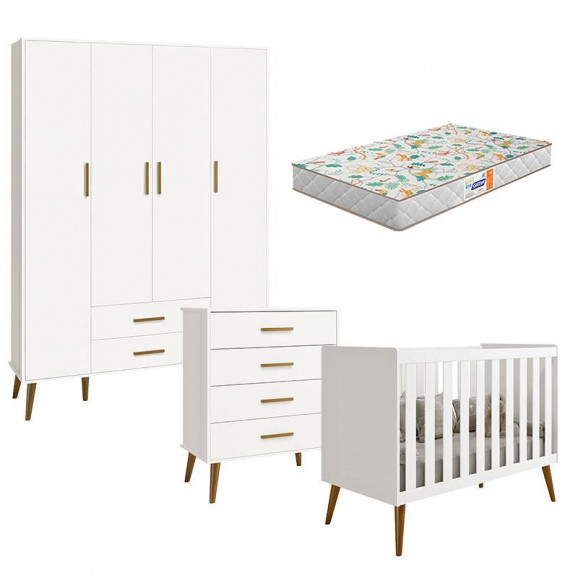 Quarto de Bebê Isis 4 Portas com Gaveteiro Branco Acetinado com Colchão Gazin - Reller