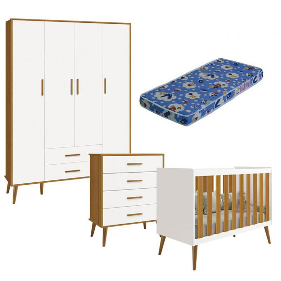 Quarto de Bebê Isis 4 Portas com Gaveteiro Branco Acetinado Savana com Colchão Ortobom - Reller