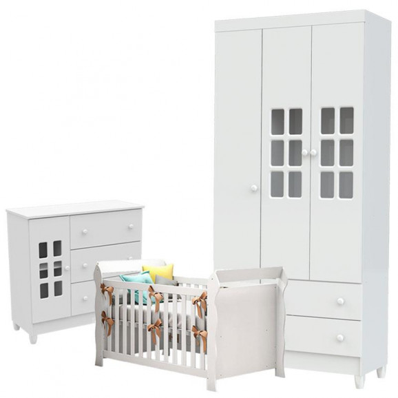 Quarto de Bebê Mariah 3 Portas com Berço Lara Branco Brilho - Carolina