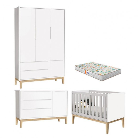 Quarto de Bebê 3 Portas New Classic Branco com Pés Madeira Natural e Colchão Gazin – Reller