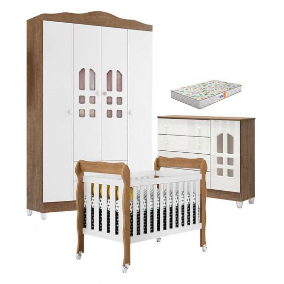 Quarto de Bebê New Selena 4 Portas com Berço Lila e Cômoda Selena Branco Acetinado Amadeirado e Colchão Gazin – Carolina Móveis