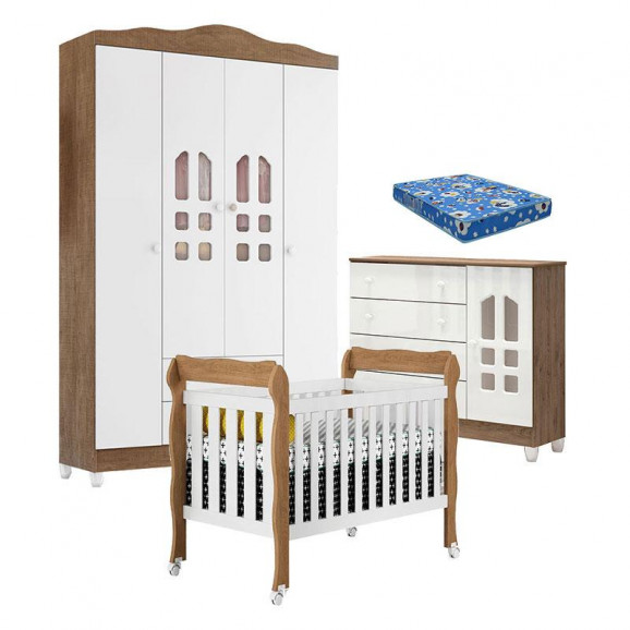 Quarto de Bebê New Selena 4 Portas com Berço Lila e Cômoda Selena Branco Acetinado Amadeirado e Colchão Ortobom – Carolina Móveis