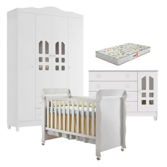 Quarto de Bebê New Selena 4 Portas com Cômoda Gran Selena e Berço Mirelle Branco Brilho e Colchão Gazin – Carolina Móveis