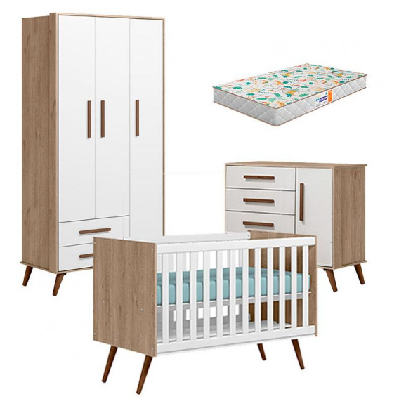Quarto de Bebê Q Encanto Retrô Carvalho TOQ Rústico Branco com Colchão Gazin - Qmovi