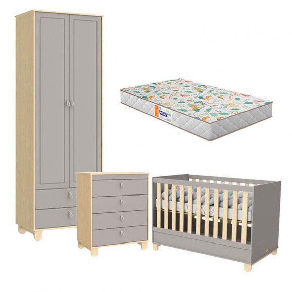 Quarto de Bebê Rope 2 Portas Cômoda Gaveteiro Natural Cinza com Colchão Gazin – Matic