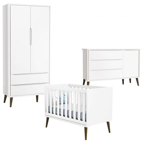 Quarto de Bebe Theo 2 Portas com Cômoda com Porta Branco Acetinado com Pés Amadeirado - Reller