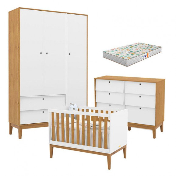 Quarto de Bebe Unique 3 Portas com Cômoda 6 Gavetas Branco Soft Freijó Eco Wood e Colchão Gazin - Matic