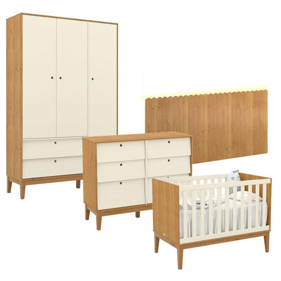 Quarto de Bebê Unique 3 Portas com Cômoda 6 Gavetas e Painel Farm com Led Freijó Off White Eco Wood - Matic