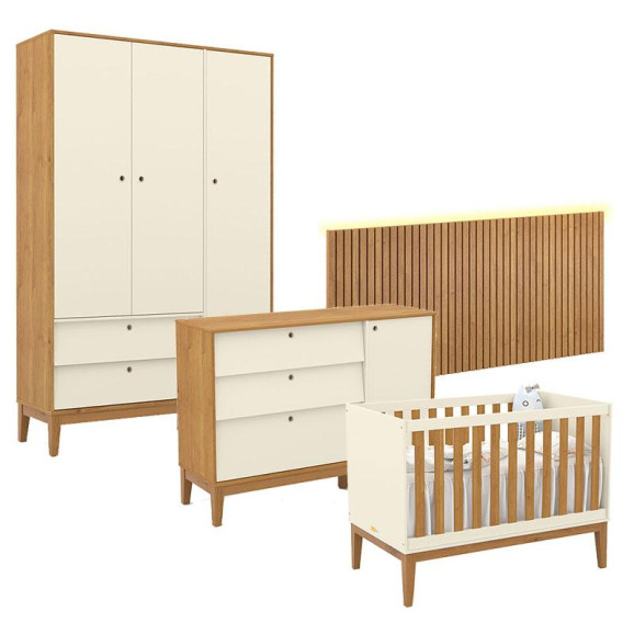 Quarto de Bebê Unique 3 Portas com Cômoda Sapateira e Painel Ripado com Led Off White Freijó Eco Wood - Matic