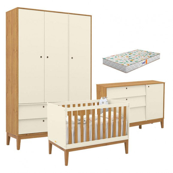 Quarto de Bebe Unique 3 Portas com Cômoda Sapateira Off White Freijó Eco Wood e Colchão Gazin - Matic