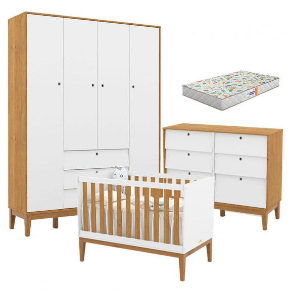 Quarto de Bebe Unique 4 Portas com Cômoda 6 Gavetas Branco Soft Freijó Eco Wood e Colchão Gazin - Matic