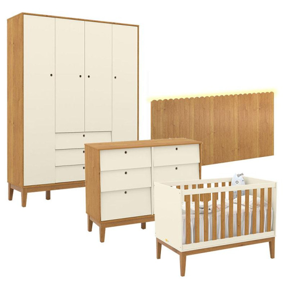 Quarto de Bebê Unique 4 Portas com Cômoda 6 Gavetas e Painel Farm com Led Off White Freijó Eco Wood - Matic