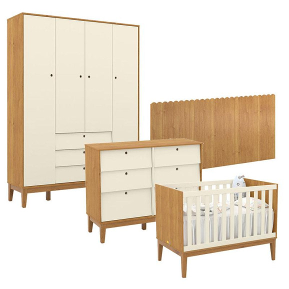 Quarto de Bebê Unique 4 Portas com Cômoda 6 Gavetas e Painel Farm Freijó Off White Eco Wood - Matic