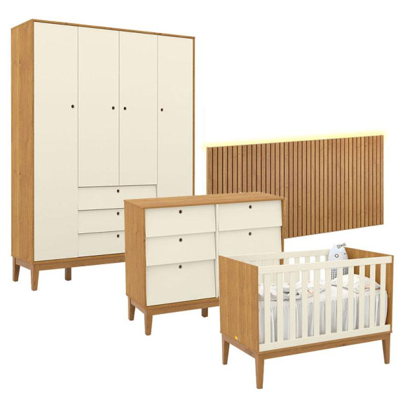 Quarto de Bebê Unique 4 Portas com Cômoda 6 Gavetas e Painel Ripado com Led Freijó Off White Eco Wood - Matic