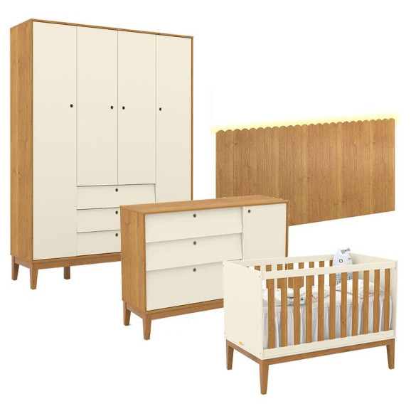 Quarto de Bebê Unique 4 Portas com Cômoda Sapateira e Painel Farm com Led Off White Freijó Eco Wood - Matic