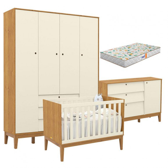 Quarto de Bebe Unique 4 Portas com Cômoda Sapateira Freijó Off White Eco Wood e Colchão Gazin - Matic