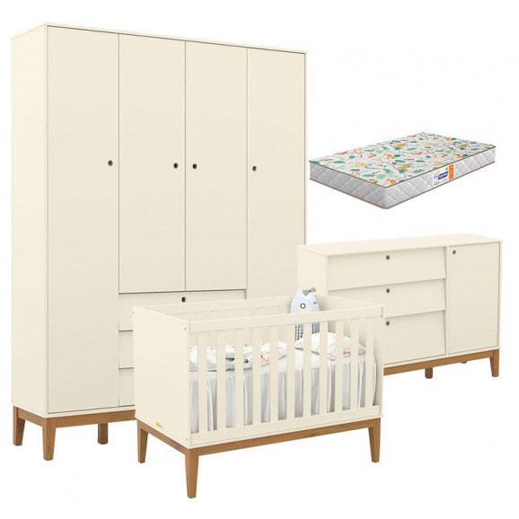 Quarto de Bebe Unique 4 Portas com Cômoda Sapateira Off White Eco Wood e Colchão Gazin - Matic
