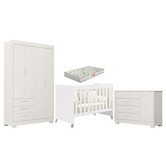 Quarto de Bebê Zaki e Berço Americano Evolution 4 em 1 Branco Acetinado com Colchão Gazin - Reller
