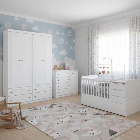 Quarto Infantil 4 Portas Americano com Berço Multifuncional Cleo Ambiente Branco Fosco com Colchão Gazin - Henn