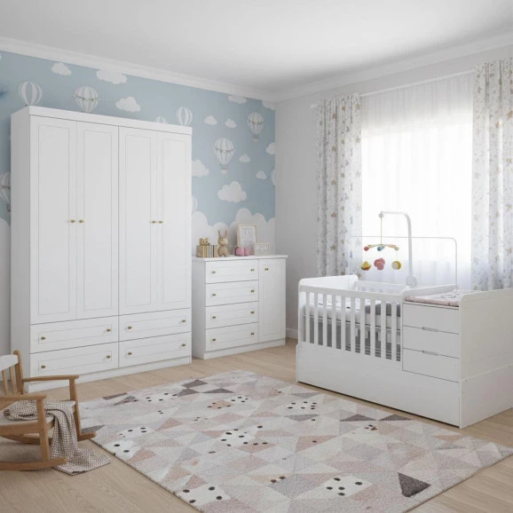 Quarto Infantil 4 Portas Mississipi com Berço Multifuncional Cleo Ambiente Branco Fosco - Henn