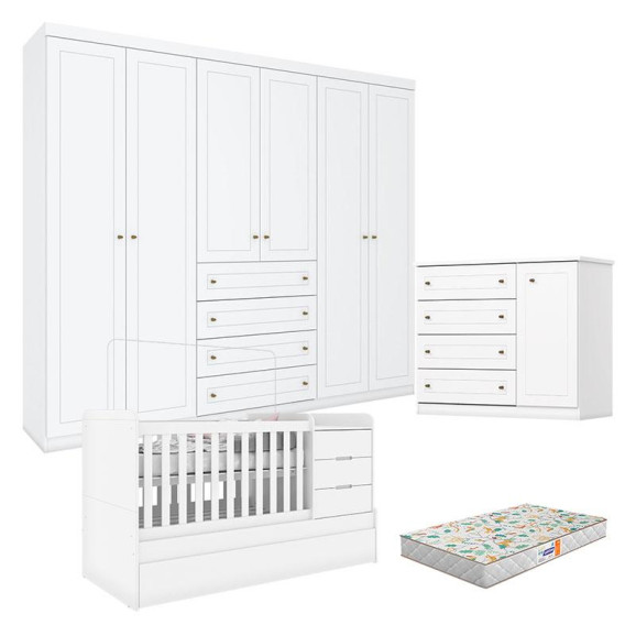 Quarto Infantil 6 Portas Mississipi com Berço Multifuncional Cleo Branco Fosco e Colchão Gazin - Henn