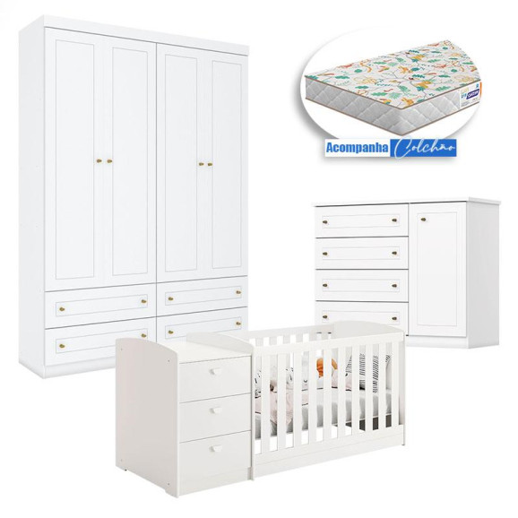 Quarto Infantil Americano 4 Portas e Berço Multifuncional Atlanta Branco Fosco com Colchão Gazin - Reller