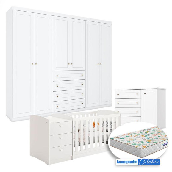 Quarto Infantil Americano 6 Portas com Berço Multifuncional Atlanta Branco Fosco e Colchão Gazin - Reller