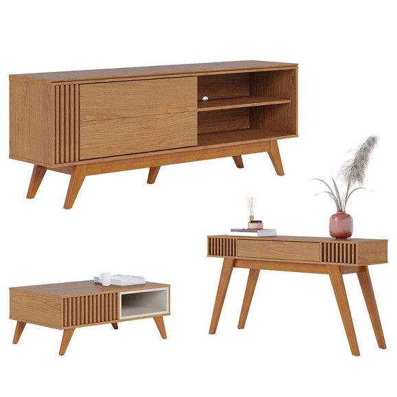 Está procurando móveis para montar sua sala? Apresentamos para você este belo conjunto composto pelo Rack Bancada com Mesa de Centro Jeri e Aparador Riviera, fabricados pela DJ Móveis. O rack possui tampo com detalhe chanfrado, detalhe frontal em ripado artesanal, 01 porta deslizante e pés em madeira maciça. A mesa possui detalhe ripado artesanal, nichos interno em dois lados de forma espelhada e pés em madeira maciça. O aparador possui 01 gaveta central com corrediças telescópicas, puxador metálico dourado fosco, ripado artesanal nas laterais, peças traseiras com acabamento possibilitando a utilização do móvel para divisão de ambientes e pés em madeira maciça. Combinando praticidade, design e sofisticação, é perfeito para quem está buscando qualidade e sustentabilidade para elevar o estilo do seu ambiente. Confira e aproveite!
